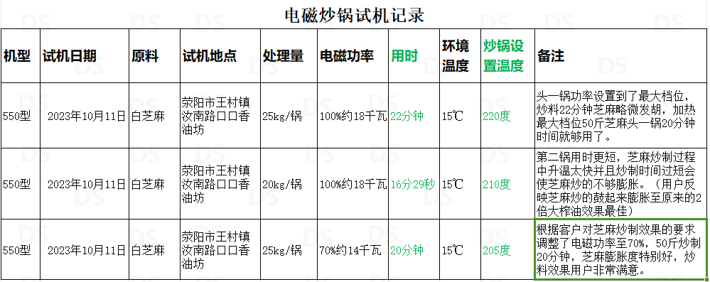 今天是2023年10月11日,今天早上我們的新型550電磁炒貨機(jī)在滎陽(yáng)市王村鎮(zhèn)汝南路口口香油坊進(jìn)行了測(cè)試試用,測(cè)試物料為白芝麻,用戶壓榨香油用。用戶油坊內(nèi)現(xiàn)有的電磁炒貨機(jī)每鍋可裝芝麻160斤,電磁功率跟我們相同為20千瓦,炒50斤芝麻冷鍋情況下需要32分鐘左右。我們的炒貨機(jī)冷鍋情況下50斤芝麻用時(shí)22分鐘(根據(jù)實(shí)際情況20分鐘即可炒好),今天測(cè)試了三鍋,平均每鍋用時(shí)20分鐘左右,用戶對(duì)我們的炒料效果和效率非常滿意。詳細(xì)測(cè)試數(shù)據(jù)我列了個(gè)表,大家可以看下。