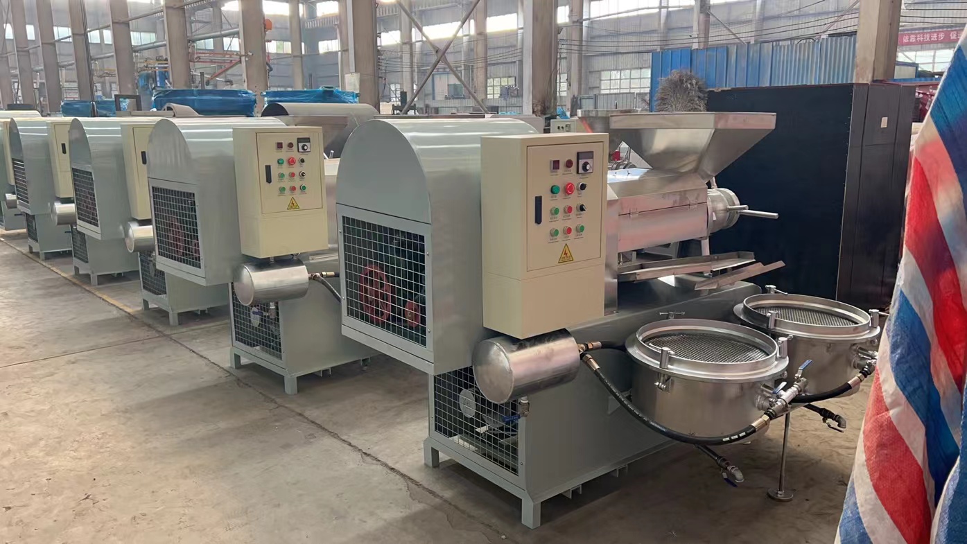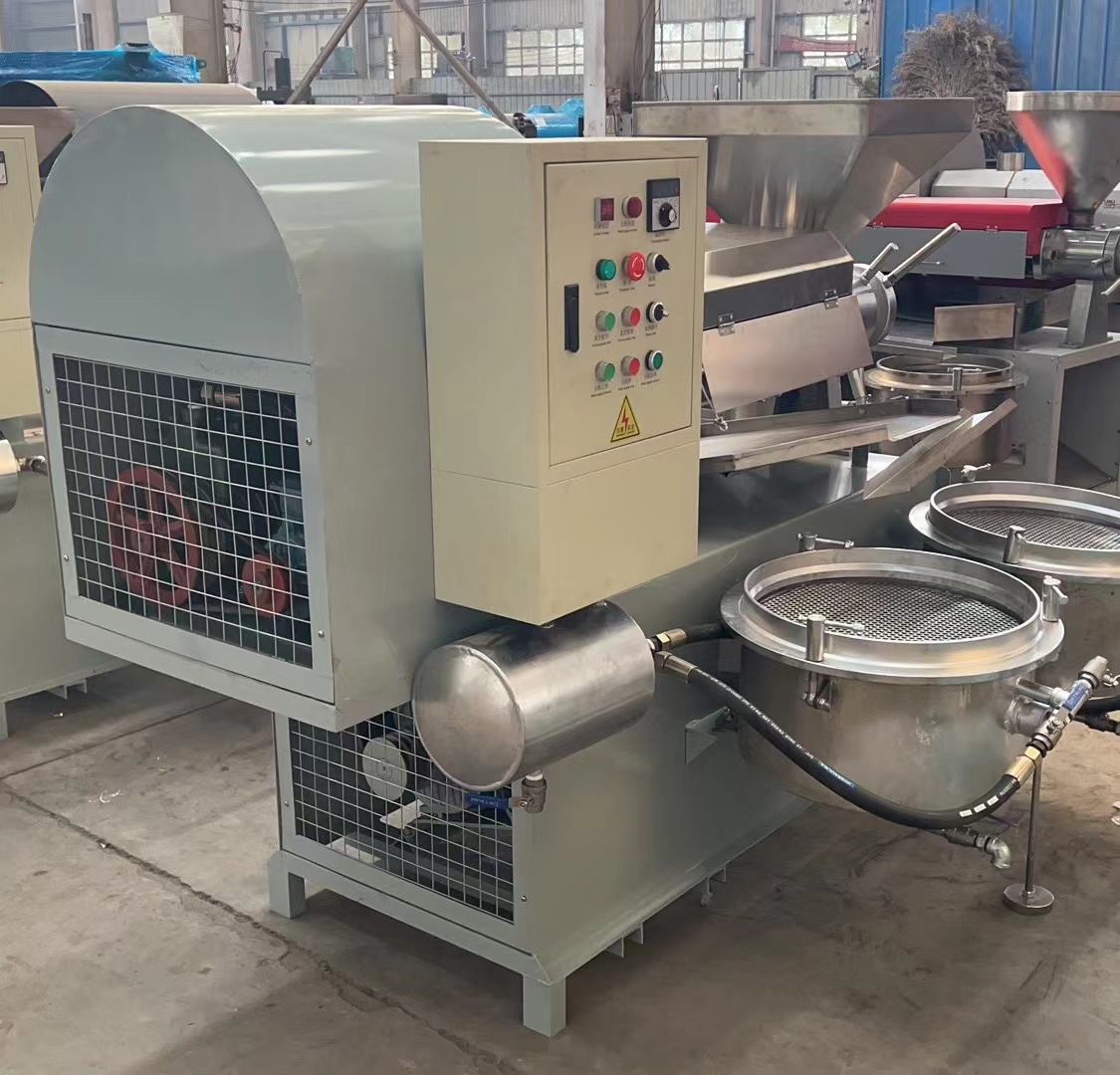 7.新榨油機(jī)安裝后進(jìn)行4—8小時(shí)磨榨,方法是用已榨干油的餅料從料斗中緩緩喂入,反復(fù)回榨,使榨膛磨光,切記開始磨榨不要將料直接倒入料斗內(nèi),而以手抓喂入為宜,以防榨螺軸卡死。如喂料過猛,榨膛內(nèi)出現(xiàn)異常響聲或榨螺軸卡死,應(yīng)立即停車,消除梗阻,或重新裝配好后再啟動(dòng)磨榨,嚴(yán)禁強(qiáng)行拖車。8.正常榨油時(shí),必須保持進(jìn)料均勻,切勿過多過少或斷料空轉(zhuǎn)。此時(shí)機(jī)器負(fù)荷正常,運(yùn)轉(zhuǎn)平穩(wěn),響聲有節(jié)奏。出餅順暢,低壓段基本無渣,高壓段有少量油渣,但渣在油中的比例不大于10%,榨膛內(nèi)溫度可達(dá)150—200℃,出餅口出冒出青煙應(yīng)通過護(hù)罩由抽煙管排出。榨出熱餅要及時(shí)攤開,不要急于打堆或裝運(yùn),否則會(huì)產(chǎn)生自然現(xiàn)象。當(dāng)連續(xù)工作時(shí)間較長,機(jī)溫過高時(shí),應(yīng)采取電扇吹風(fēng)等降溫措施。